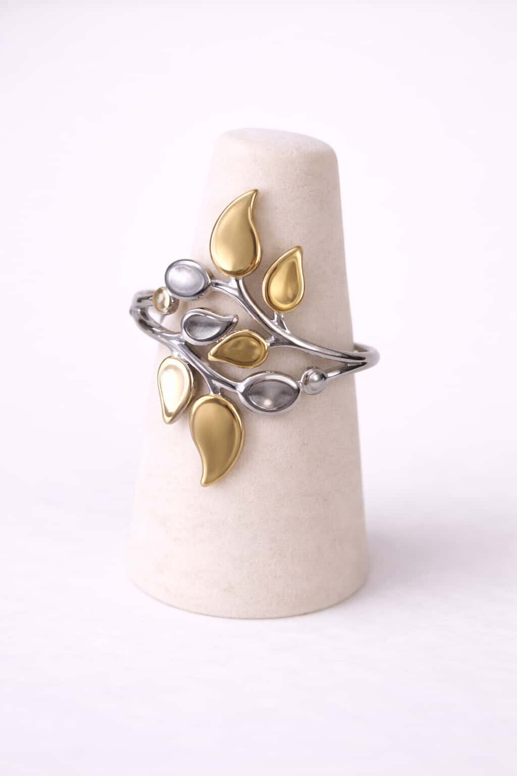 Bague argentée or fleur feuille réglable